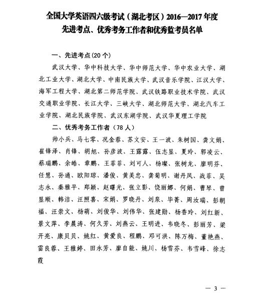 本网讯(通讯员 胡冰儿)近日,湖北省教育考试院举行2016-2017年度全国大学英语四六级考试(湖北考区)先进考点表彰大会,并正式发文公布了《省教育考试院关于表扬2016-2017年度全国大学英语四六级考试(湖北考区)先进考点和优秀个人的通报)》(鄂综考〔2018〕12号),以表彰在2016-2017年度我省大学英语四六级考试工作中有优异表现的考点。在此次表彰中我院被评为“2016-2017年度大学英语四六级考试(湖北考区)先进考点”。